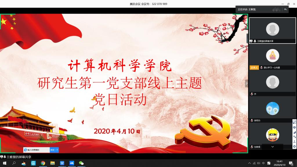 为深入学习贯彻习近平总书记关于疫情防控重要讲话、重要指示批示精神,积极响应陕西省委和校党委号召开展向“三秦楷模”等先进人物和先进集体学习的活动。4月10日下午,365英国上市官网在线研究生第一党支部利用网络平台开展线上专题组织生活会和主题党日活动,支部全体党员参加,会议由党支部书记王雅慧主持。