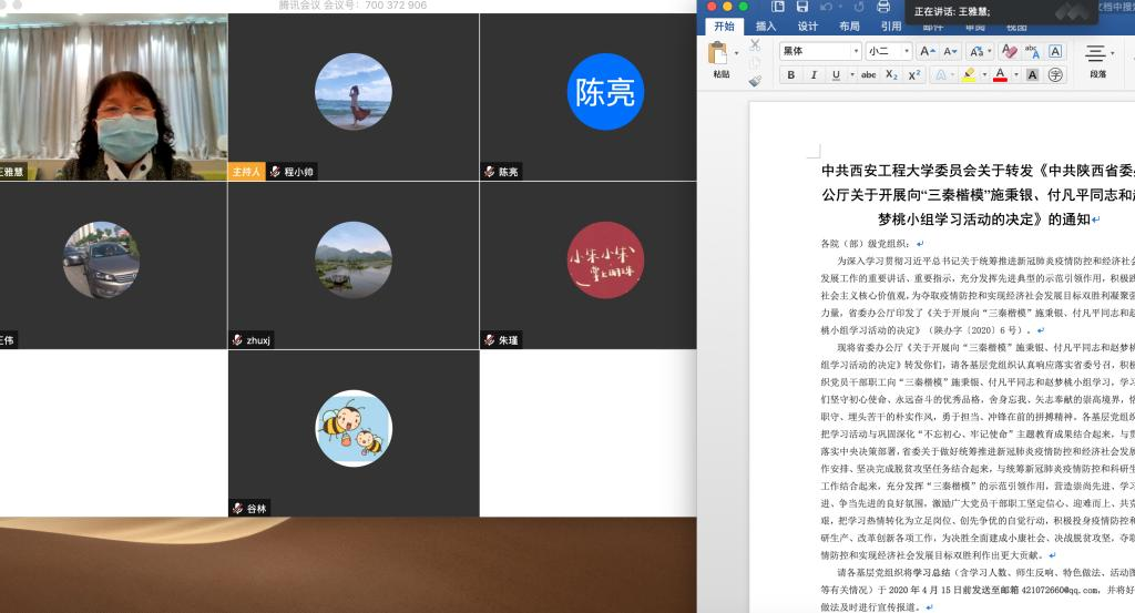 4月13日下午,365英国上市官网在线召开党委理论学习中心组学习会,认真学习施秉银等“三秦楷模”和全省优秀共产党员的先进事迹并开展讨论交流。会议采取线上线下相结合的方式进行,会议由院党委书记王雅慧主持。