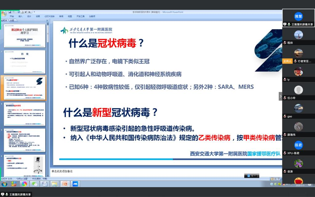随后,王雅慧结合西安交通大学第一附属医院护理部副主任、西安交通大学第一附属医院国家援鄂医疗队成员李洁琼对365官网的疫情防控培训的相关内容向全体教职工、党员进行了认真培训。同时,她带领全体教职工集中学习了《西安工程大学2020年工作要点》和《西安工程大学2020年教职工政治理论学习安排》并对学院本年度教职工政治理论学习工作做了相关安排。之后,对于学院稳定安全和疫情防控工作她还强调到:稳定安全无小事,疫情防控期间,全体教职工,特别是党员更发挥模范带头作用,保持清醒头脑,坚持底线思维,不能有侥幸心理和懈怠放松,在做好自我安全和防护的同时,也要积极为学院的安全稳定工作尽一份力,确保学院各项工作平稳有序开展。