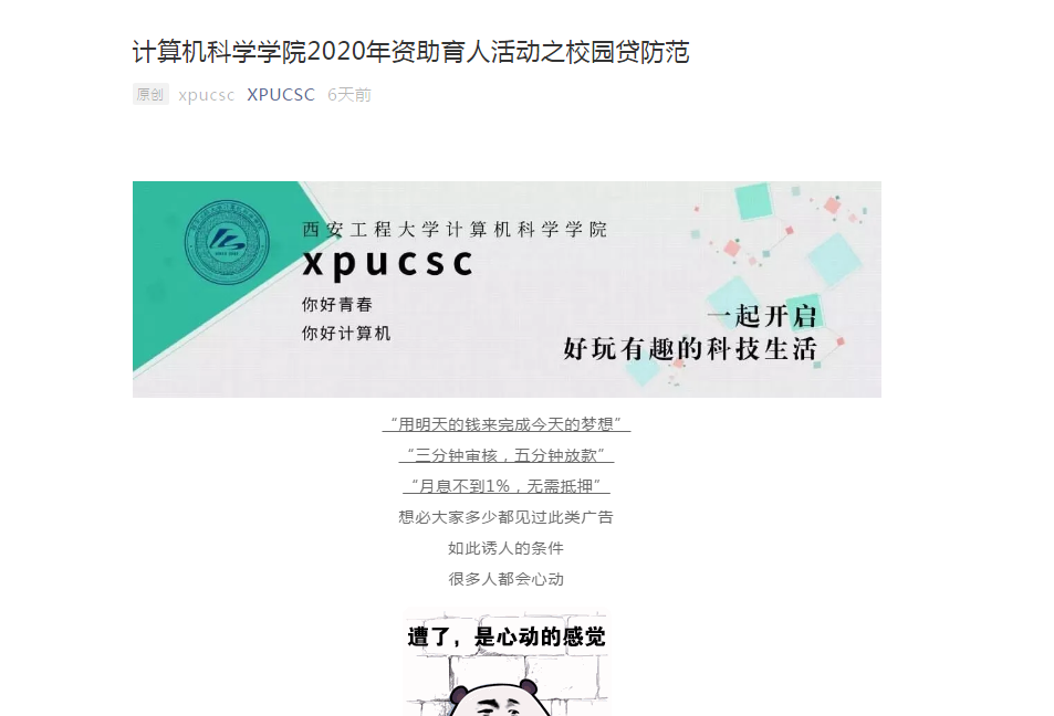 体平台刊载了有关校园贷防范的宣传材料,普及校园贷相关知识,引导学生树立正确的消费观,抵制盲目消费、跟风攀比的诱惑,塑造学生良好的信贷意识,倡导拒绝校园贷,青春不负贷。