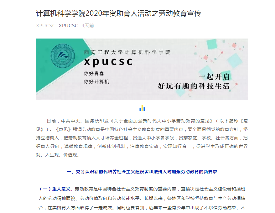 当前,高校正在全面落实立德树人根本任务,悉心培养德智体美劳全面发展的高素质人才。为了让学生充分认识到新时代培养社会主义建设者和接班人对加强劳动教育的新要求,帮助学生树立正确的劳动观念,端正劳动态度,养成良好的劳动习惯,实现德智体美劳全面发展。学院扎实开展好线上劳动教育宣传。