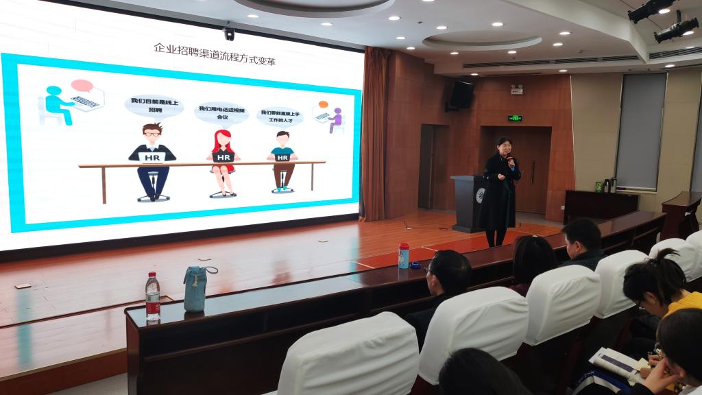 随后,刘佳从探索就业的那点事、筹谋未来发展规划、帮你找寻自己的路、建立通往职场阶梯等几个方面向在座的毕业生们分享了“就业那点事”,普及了诸多就业的知识经验。她希望大家:一是要树立正确的就业观择业观,就业不难,但就好业难,同学们一定要对自己的能力、实力有客观正确的认识,广泛寻求机会,把握住机遇;二是要对自己有明晰的职业规划,能够科学合理搭建通往职场的阶梯,利用各方面的优势条件为自己的职业发展服务,谋划好自己的未来。