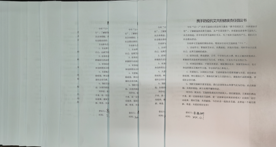 为了向更多同学传播抗疫防艾的正能量,全体师生还在“携手抗疫防艾共担健康责任”倡议书上进行了签名。(撰稿:左温慧 审核:周波)