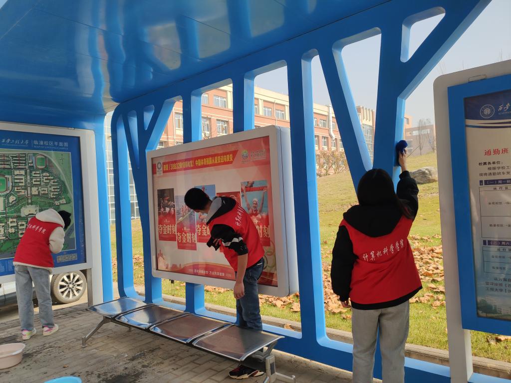 活动中,党员们身穿红色马甲,手拿抹布、水桶等清洁工具,对校园内的所有宣传栏橱窗进行认真清理,对宣传栏橱窗玻璃和死角进行了擦拭,并宣传呼吁同学们爱护校园公共设施、不在公共场所堆放杂物,保持学校环境干净整洁。
