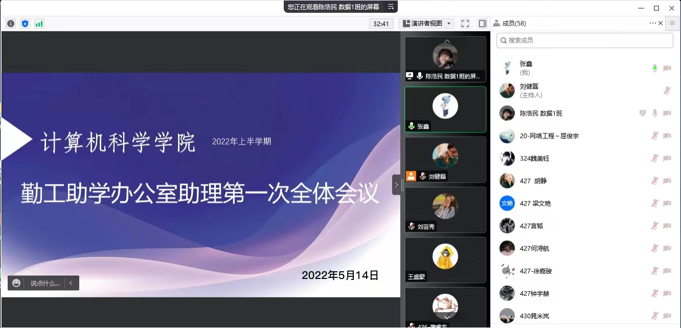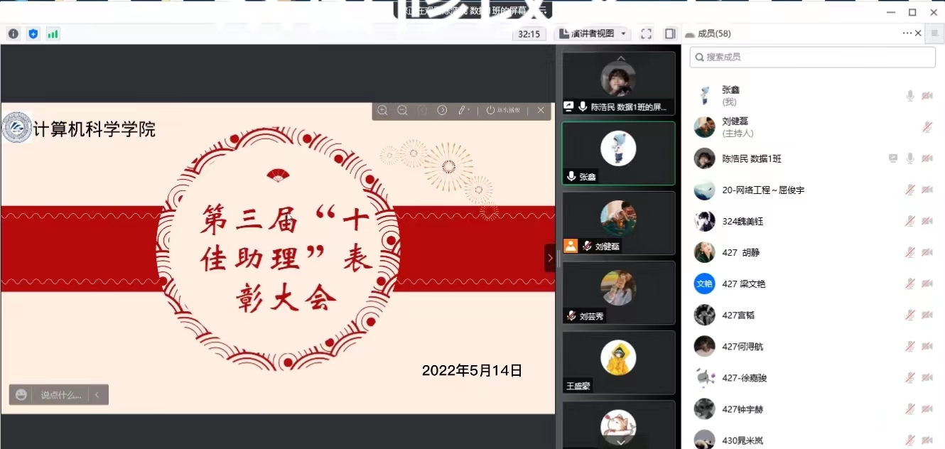 5月14日晚,365英国上市官网在线通过腾讯会议线上召开了勤工助学办公室助理大会暨第三届“十佳助理”表彰大会。学院资助辅导员左温慧、张鑫及60余名勤工助学办公室助理参加了大会。