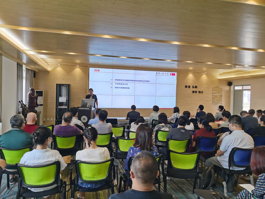 会上薛涛院长对学院2022年上半年工作进行全面总结。他对标学院2022年绩效目标考核任务,分别从教学、科研、学科建设、学生管理、研究生培养等七个方面进行回顾总结,分析了工作中存在的问题、差距和原因,对学院下半年重点工作提出要求并作出整体部署,希望教职工结合实际围绕学院目标任务,确定努力方向,全力完成绩效考核任务。