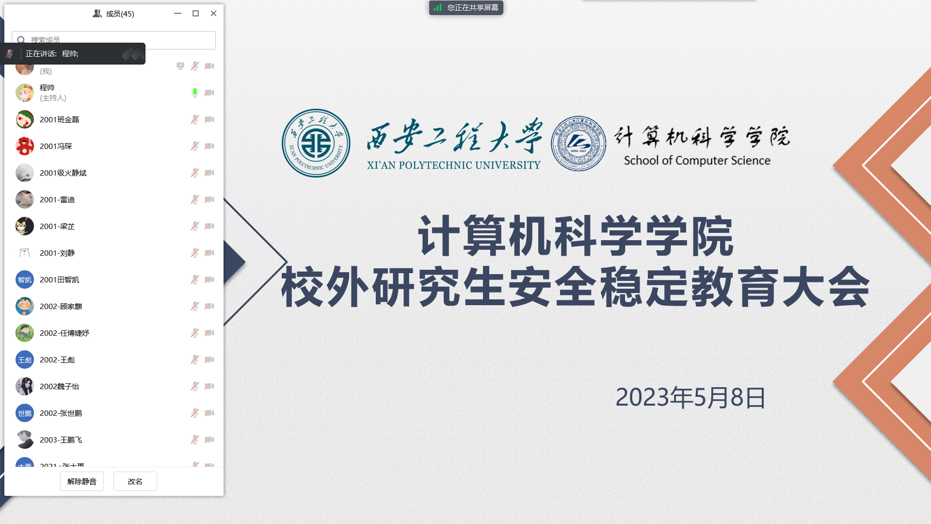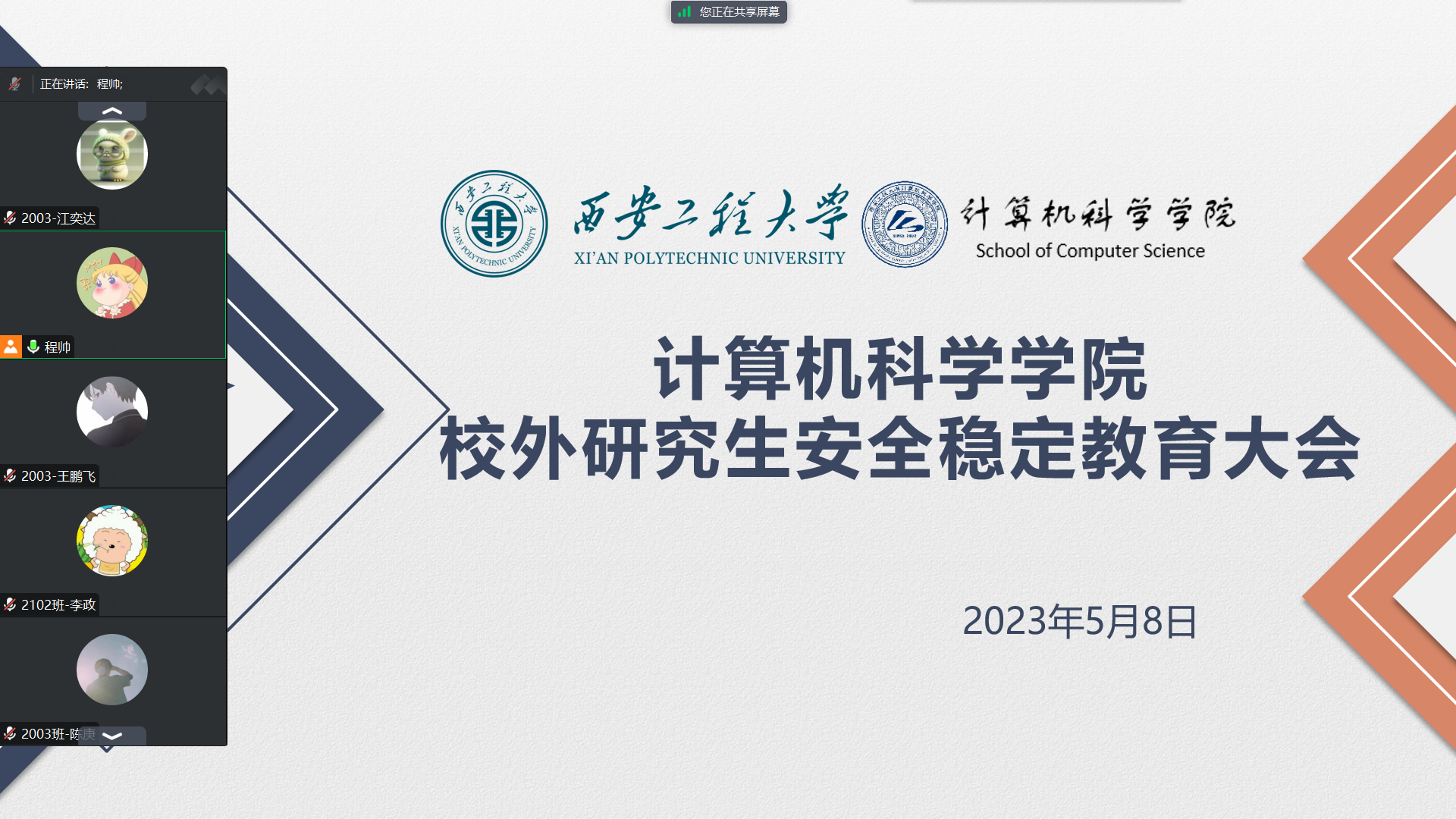 为进一步加强我院校外研究生教育管理,营造安全、健康、稳定的研究生培养秩序,5月8日下午,365英国上市官网在线召开了校外研究生安全教育大会。院党委副书记赵勇进、研究生辅导员程帅、兼职辅导员党子妍以及校外研究生(线上)参加此次会议。会议由程帅主持。