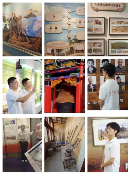 八步沙所在的中国西北地区长期饱受荒漠化及沙尘暴的侵害,在极其艰苦的条件下,八步沙第一代治沙人喊出“困难面前不低头,敢把沙漠变绿洲”的口号,齐心协力、万众一心开展了一场轰轰烈烈、造福后代的治沙运动。实践团成员跟随讲解员的脚步,参观了以“绿之梦”为主题的纪念馆,感受到了三代治沙人的艰辛历程和力缚黄龙、同佑绿色的治沙壮举。大家认真学习了开沟、铺草、埋压等一系列治沙流程,体会治沙过程之不易,也深刻领悟到“矢志不渝、拼搏奋斗,科学治沙、追求绿色发展”的“八步沙六老汉”精神内涵。“生态兴则文明兴,生态衰则文明衰”,我们应积极学习国家生态保护政策,以实际行动践行“两山理论”,用所学专长为国家生态屏障构建贡献青年学子的力量。