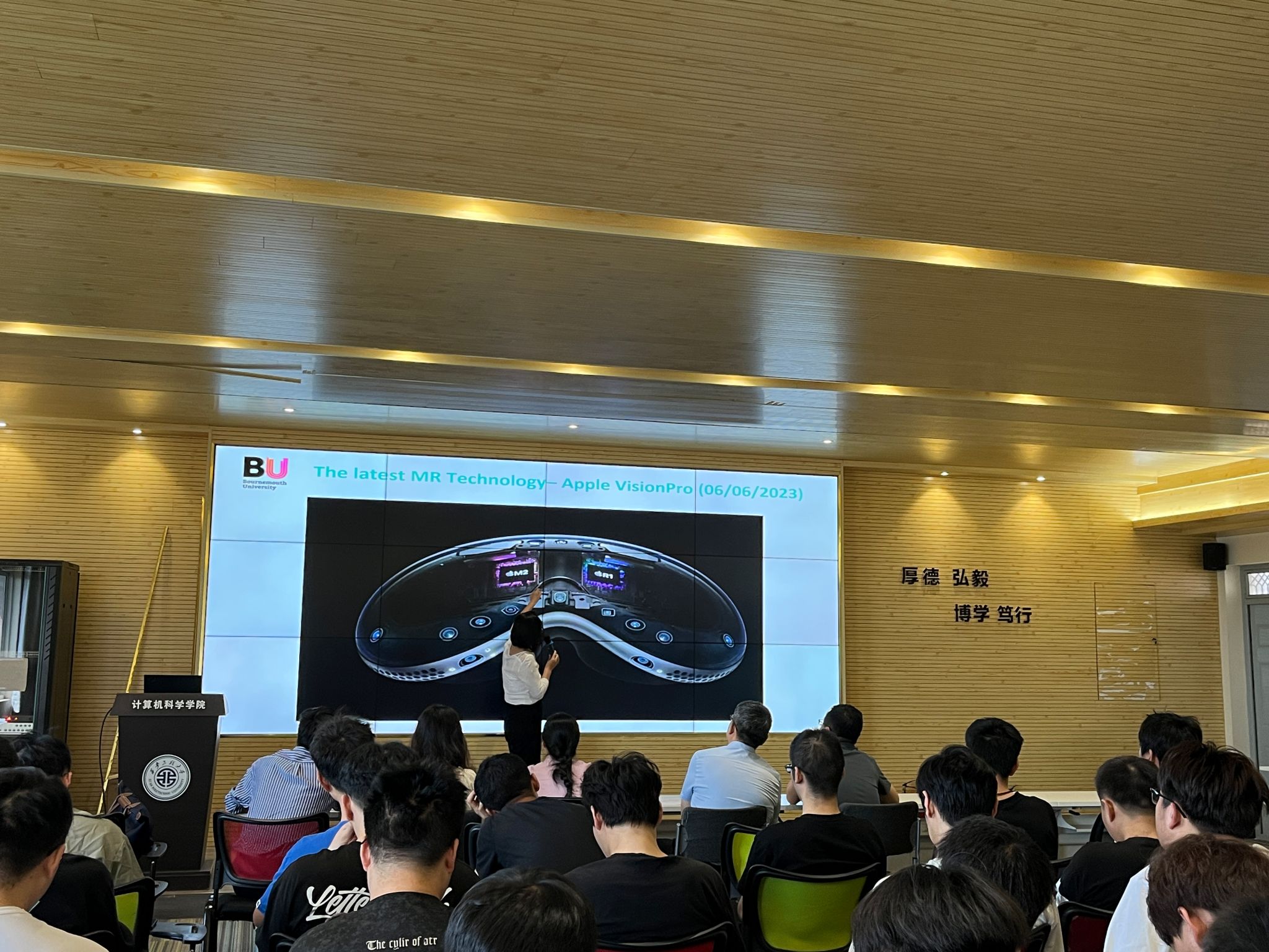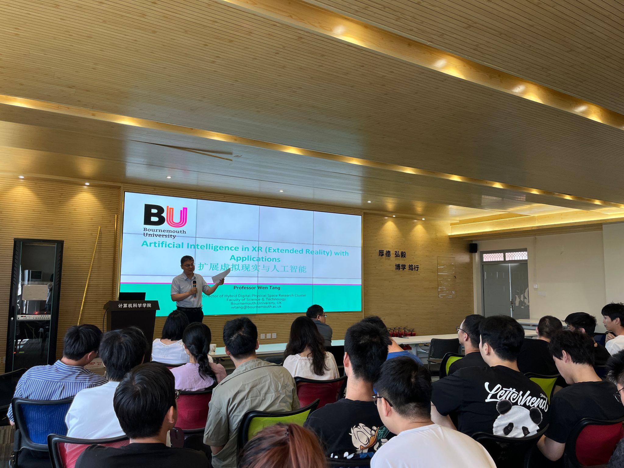 5月14日上午10:30,365英国上市官网在线在笃行楼614报告厅举办第二十五期经纬学术沙龙,Bournemouth University(伯恩茅斯大学,英国)汤汶教授应邀做主题为“人工智能在扩展现实的应用(AI in XR with Applications)”学术报告。学院院长薛涛、副院长张凯兵、学院青年教师和研究生代表80余人参加了报告会。本次报告会由薛涛主持。